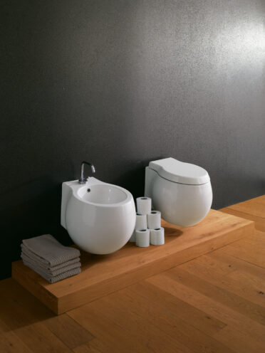 אסלה תלויה מרובעת ומושב הידראולי , עכשיו פרט ללבן גם בגימור חיצוני מוכסף שחור או מוזהב.
