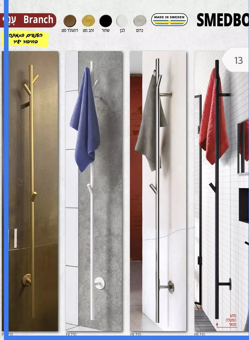 מייבש ענף – מייבש מוט, מעוצב כענף, כולל מפסק מואר, ואפשרות לחיבור ישיר לקיר(או שקע תקע) בגימור שחור,לבן,זהב מט או כרום ניקל. מידות גובה: 172 או 90 סמ .